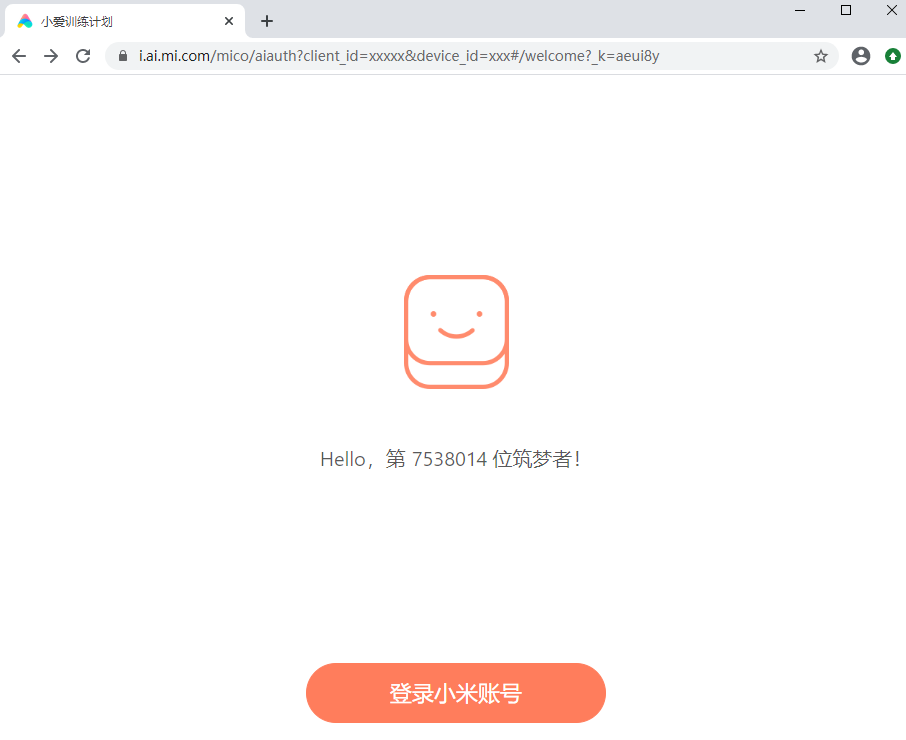 1、在浏览器中输入https://i.ai.mi.com/mico/aiauth?client_id=xxxxx&device_id=xxx 访问。其中client_id和device_id可以在开放平台中获取。