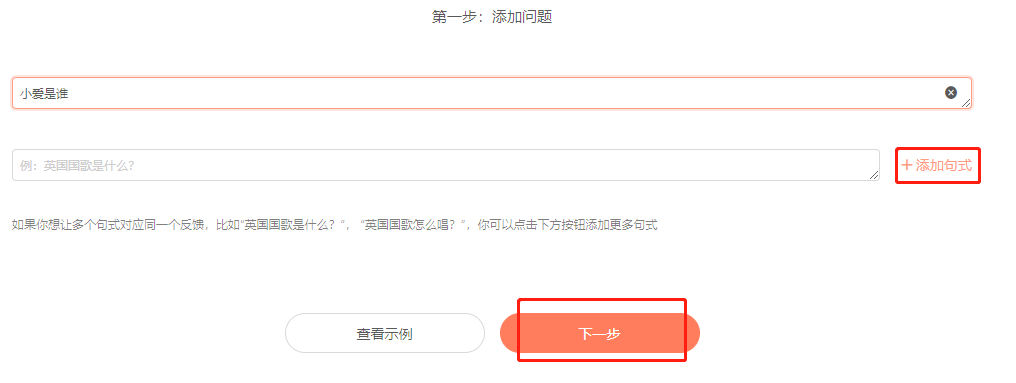 4、在输入框中,填入需要提问的问题,如果有多个句式对应同一个答复内容,可以点击“添加句式”,输入多个问题,输入完成后,点击“下一步”。